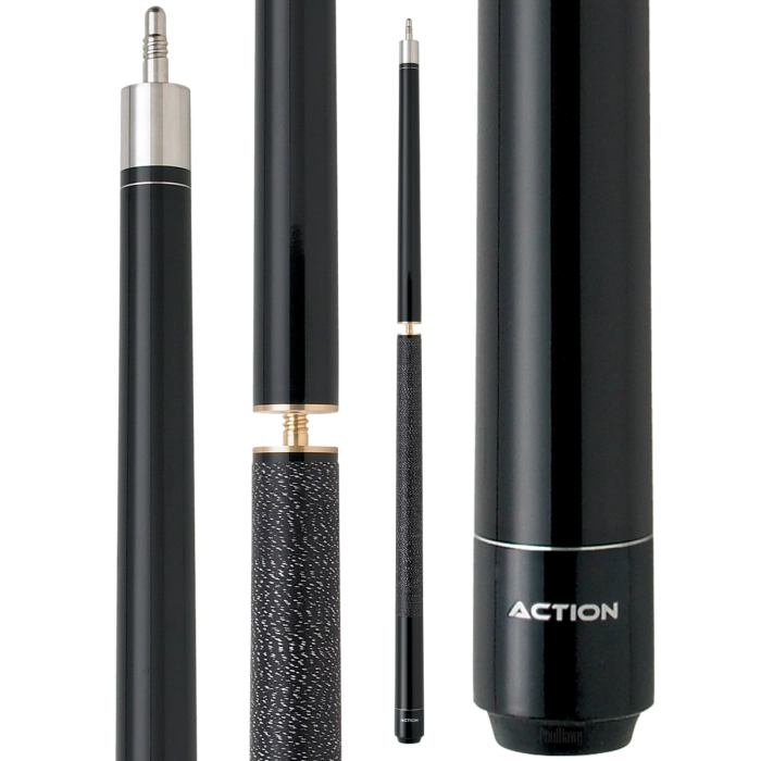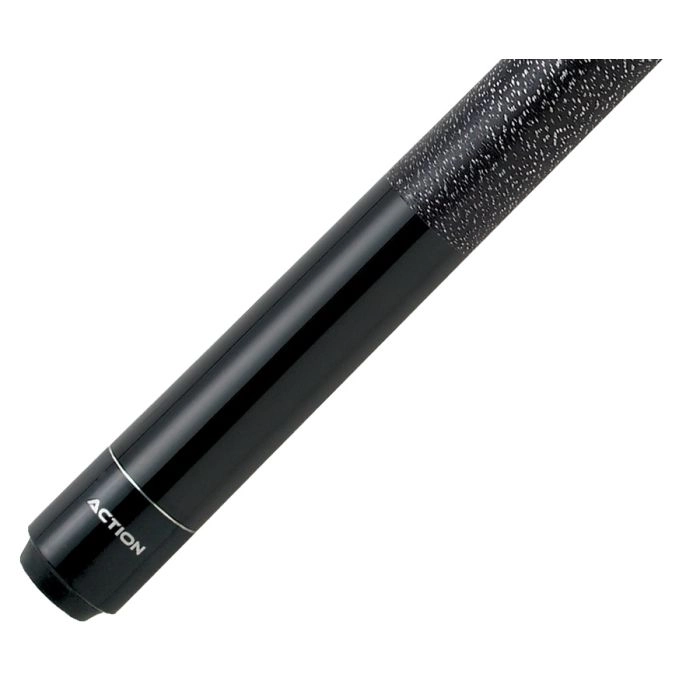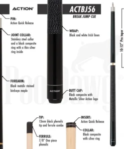 Smooth, sleek and simple, the design of the Action ACT56 Break/Jump cue allows you to focus on the task at hand without distraction. Just beyond the hardrock maple shaft, black metallic stained Birdseye maple on the forearm and sleeve combine with a black Irish linen wrap with white specks to complete the look.
