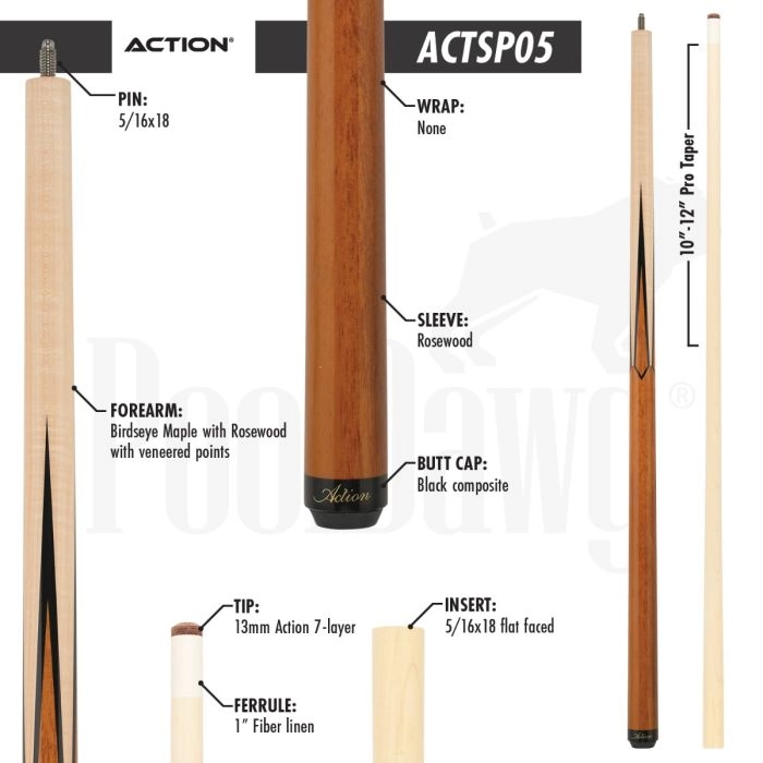 Superior craftsmanship is masked behind a traditional design, making this cue ideal for beginners to advanced shooters who favor a compact, solid hit. Satisfaction is guaranteed with all Action cues.
