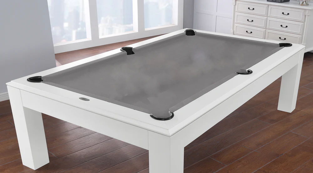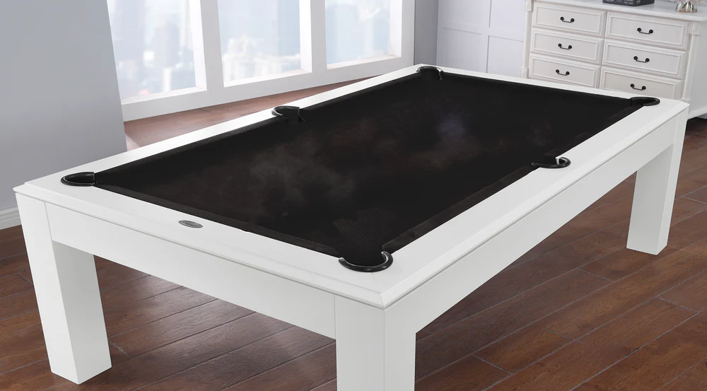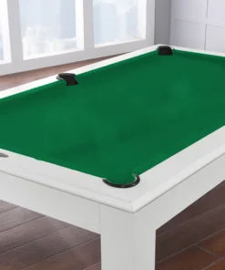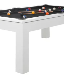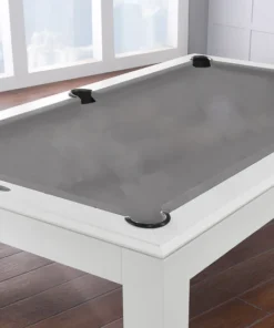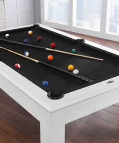 The Aragon 7 Foot Pool Table with Dining Top White will be the center of attraction in any game room. Featuring Solid wood Construction, this table is designed to offer supreme playability and elite quality. No MDF, particleboard or other artificial materials are used in the exterior craftsmanship or construction of our tables. The multi-step finishing process, which includes petroleum-based stains applied by hand and sealed with catalyzed varnish, brings out the natural luster and beauty of the wood grain. This finish is impervious to water rings and resistant to cue scuffs, ball marks and perils of day-to-day use. The rails are bolted through the slate by a two-piece T-nut rail design at 3 separate points on each rail, giving the table maximum ball response. The “Ultimate Response” K-66 cushions are professionally built to meet or exceed BCA tournament specifications. Both the cabinet and slate beams are a 1-1/2″ minimum thickness, providing strength to the already resilient and rigid unified body design and boast. The three-piece 1″ slate is cut to a precision fit with a solid wood slate support frame bonded to the underside of each slate piece. While the legs add aesthetic value, the triple-anchor leg support also has exceptional weight bearing capability. This table also includes a deluxe accessories kit, which offers standard items like pool balls, ball racks and pool cues, this kit has everything you need to enjoy your pool table. With detailed inlaid diamond wood spot sights and genuine leather pockets, this pool table is the perfect centerpiece for your man cave or game room. Additionally, this table is covered by a free lifetime warranty. The Aragon Pool Table features: