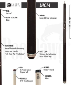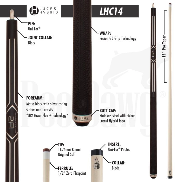 Lucasi Pool Cues are a staple brand in the billiards world. This LHC14 Lucasi Hybrid pool cue comes set up for performance with the Zero Flexpoint Low Deflection Hybrid shaft, a Kamui tip and the G5 grip with the X-Shoxโข dampening system resulting in a 27% decrease in vibration through the cue when shooting. The LHC14 features a matte black with silver accent racing stripes and comes standard with the 11.75mm Slim Hybrid shaft. If you prefer the 12.75mm, we can exchange it for no additional cost. You canโt beat the 8-piece radial spliced TSC Construction on those Lucasi Hybrid shafts. The unique 4-piece butt construction will give you durability and a solid hit.
