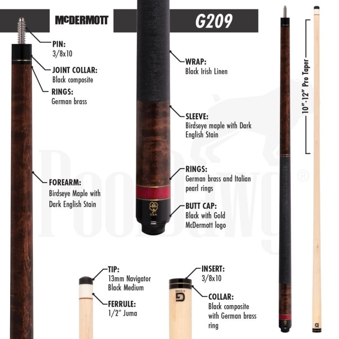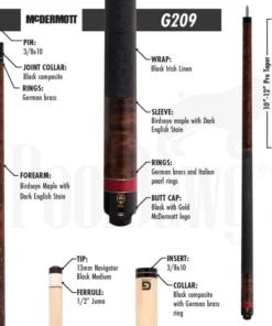 This model is elegant and simple in design, featuring stained Birdseye maple with red accent rings. The G-Core shaft is engineered using McDermott’s proprietary CT tenon technology which incorporates carbon fiber in between layers of wood to increase tensile strength and decrease game-killing deflection and vibration. The Navigator Black Medium tip that comes standard is designed for the perfect balance of structure and grip resulting in a long-playing tip that holds it’s shape without being too firm.