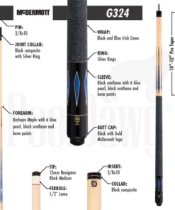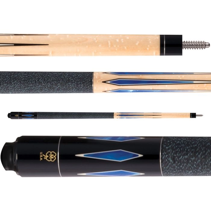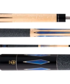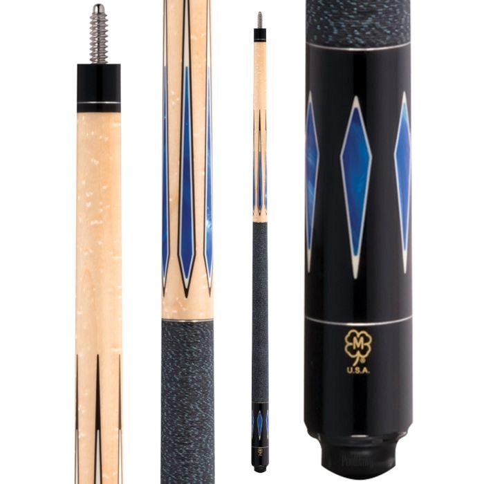 Six beautifully crafted floating blue pearl points, framed with simulated bone and black pearl are inlaid around the unstained maple forearm of this new McDermott cue. These gorgeous points are mirrored on the sleeve below, set against a midnight black background and separated by a stylish black and blue Irish linen wrap.