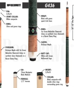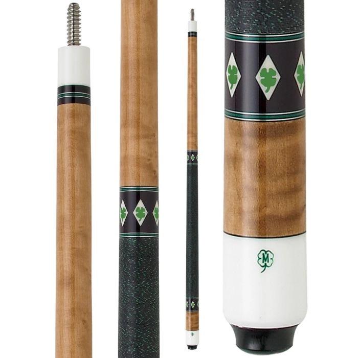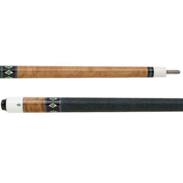Bring along the luck of the Irish with the McDermott Dubliner pool cue. Featuring a total of 12 green malachite shamrock inlays set in synthetic Ivory diamonds, this stunning cue has quickly become one of the highest demand cues in the entire McDermott cue line. Combine that with classic nickel silver rings, stunning Birdseye maple and a black and green Irish linen wrap and you have one of the most elegant cues in the entire McDermott line.